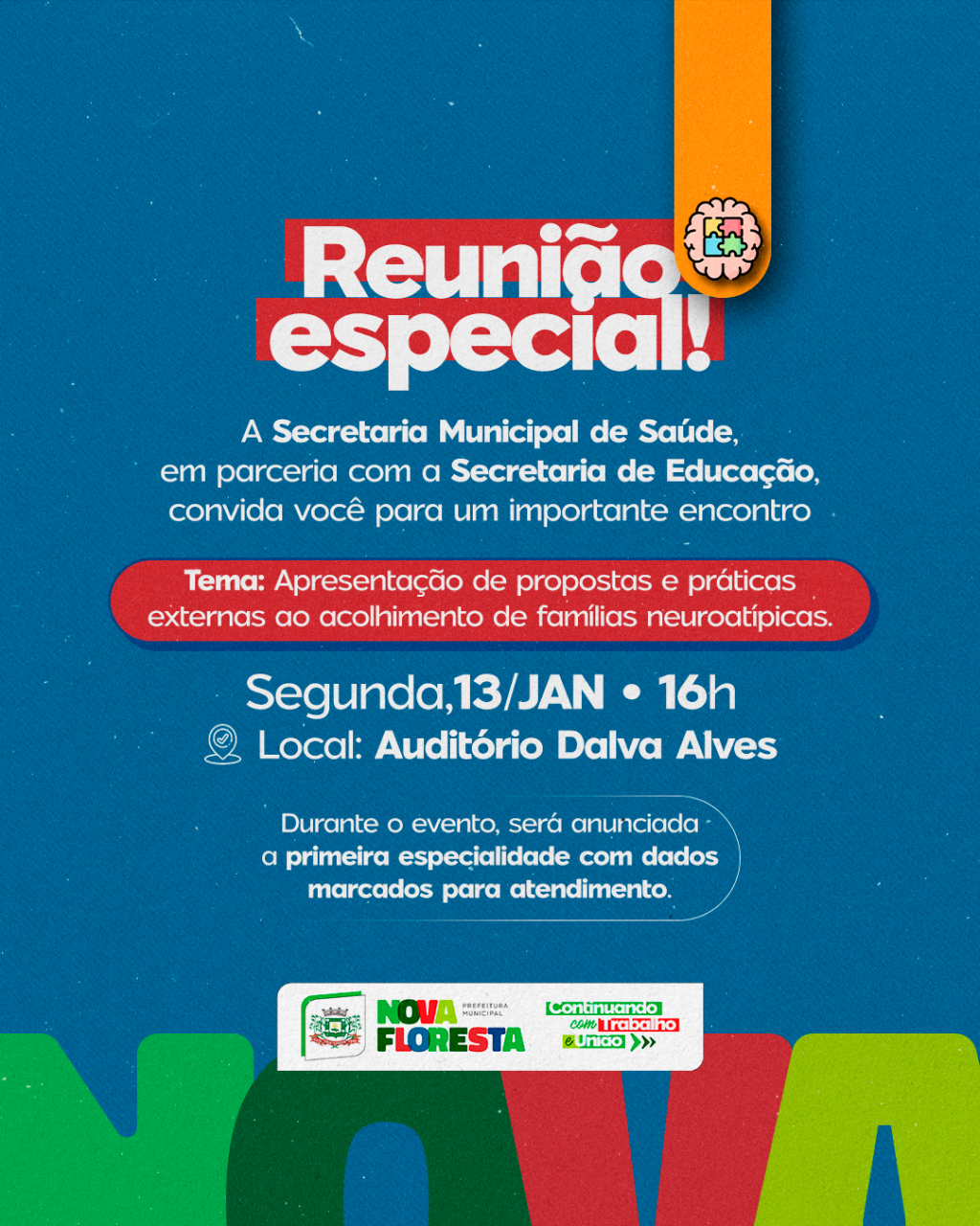 A Prefeitura de Nova Floresta, por meio da Secretaria Municipal de Saúde e da Secretaria Municipal de Educação, tem a honra de convidar todas as famílias para um importante momento de acolhimento e diálogo sobre o cuidado com pessoas neuroatípicas em nossa cidade.