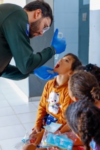 A atividade contou com a participação do dentista Rafael e do auxiliar Joedson, que também realizaram aplicação de flúor e contribuíram com orientações práticas para o dia a dia das crianças.
