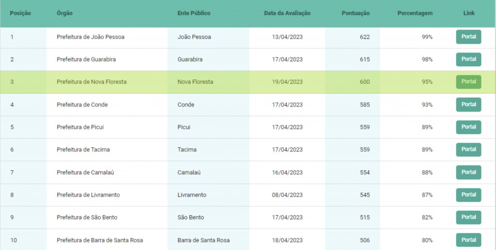 Concorrendo entre 223 Municípios, a Prefeitura de Nova Floresta se destaca ocupando a terceira posição no ranking, com um total de 600 pontos (95%), no momento da consulta. Os números do relatório do TCE comprovam o comprometimento da administração em gerir da melhor forma os recursos públicos com responsabilidade.