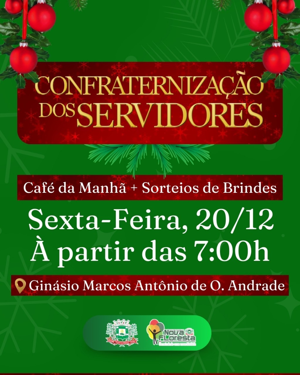 Prefeitura Municipal de Nova Floresta promove a Confraternização dos Servidores, sexta-feira, 20 de dezembro, com café da manhã e sorteio de brindes. Mais um ano em que estamos unidos para confraternizar tudo aquilo que vivemos até aqui. Estamos prestes a encerrar mais um ciclo de muito aprendizado, crescimento e conquistas. Desejo ainda mais coragem e entusiasmo para todos nós!🍾🎁🎉