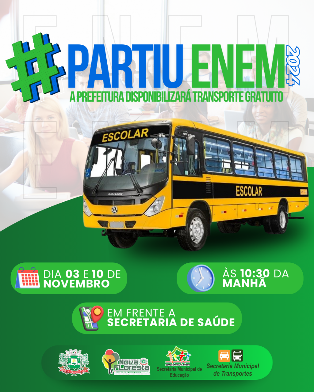 A Prefeitura Municipal de Nova Floresta, através da Secretaria Municipal de Educação juntamente da Secretaria Municipal de Transporte, disponibilizará neste Domingo (03) e no próximo (10), transporte gratuito para aqueles que irão realizar a prova do Enem em Cuité-PB, o Ônibus saíra do centro da cidade, em frente a Secretaria de Saúde às 10:30h da manhã.