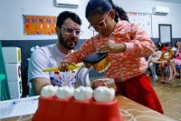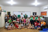 A atividade contou com a participação do dentista Rafael e do auxiliar Joedson, que também realizaram aplicação de flúor e contribuíram com orientações práticas para o dia a dia das crianças.