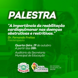 A Prefeitura de Nova Floresta, através da Secretaria Municipal de Saúde, promoverão nesta quarta-feira (19), uma palestra sobre a importância da reabilitação pulmonar em pacientes com sequelas da COVID-19, e outras doenças obstrutivas crônicas como; asma, bronquite, enfisema pulmonar, entre outras doenças. A palestra será ministrada pelo fisioterapeuta Dr. Fernando Freitas, especialista em pulmão. Toda população pode participar dessa importante palestra, que será no auditório da secretaria de educação, a partir das 08h da amanhã.