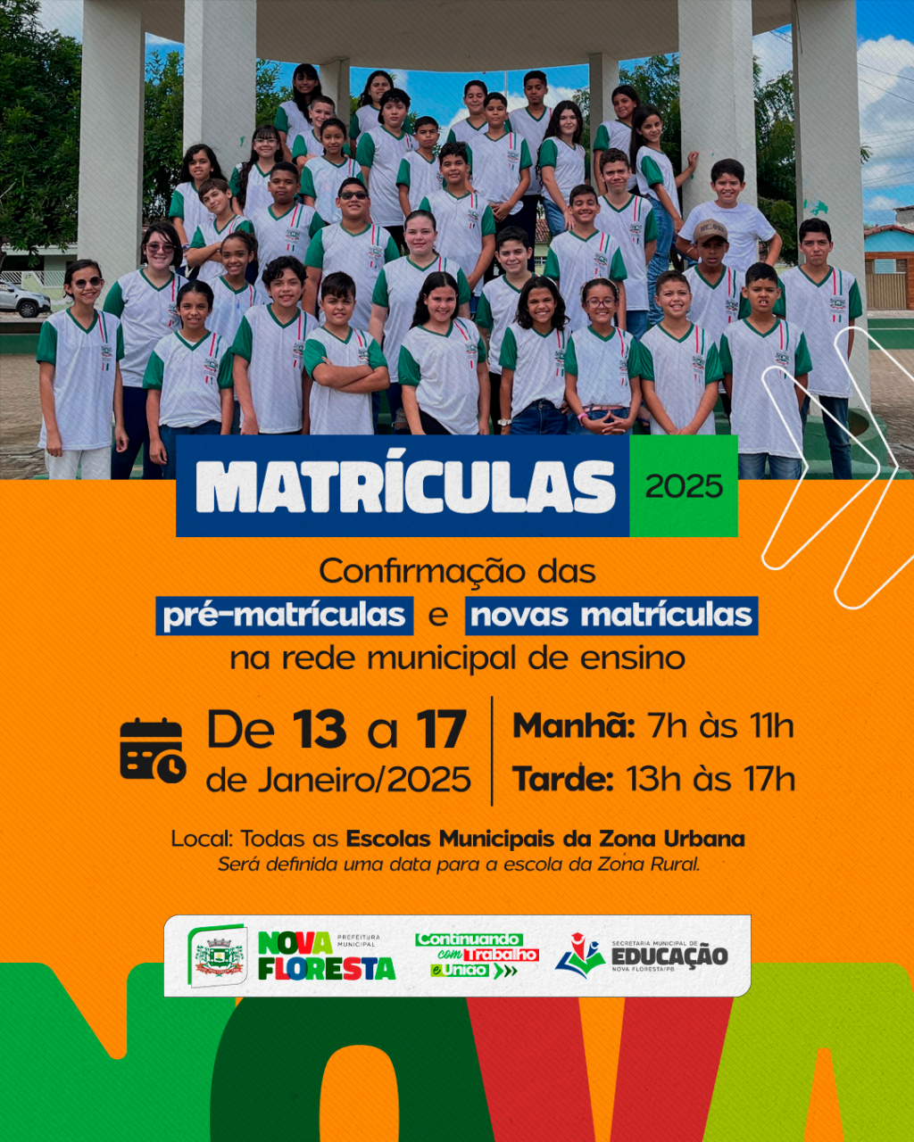 A Prefeitura de Nova Floresta informa que estão abertas as matrículas para alunos da rede municipal de ensino, tanto para a educação infantil quanto para o Ensino de Jovens e Adultos (EJA).