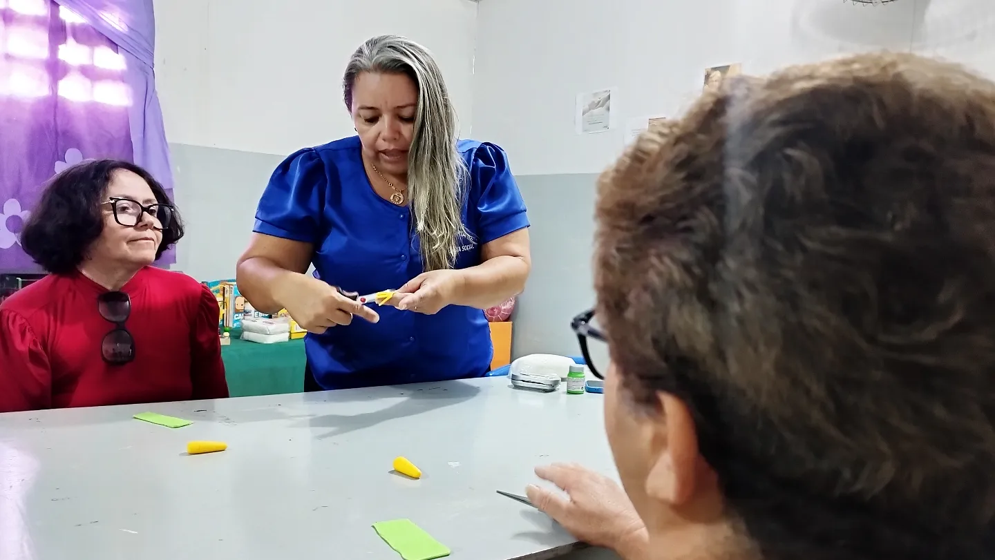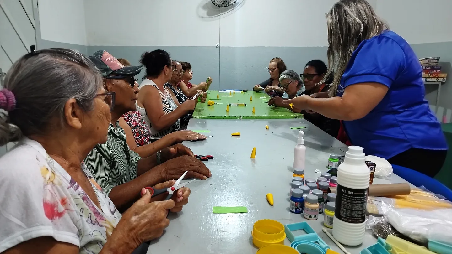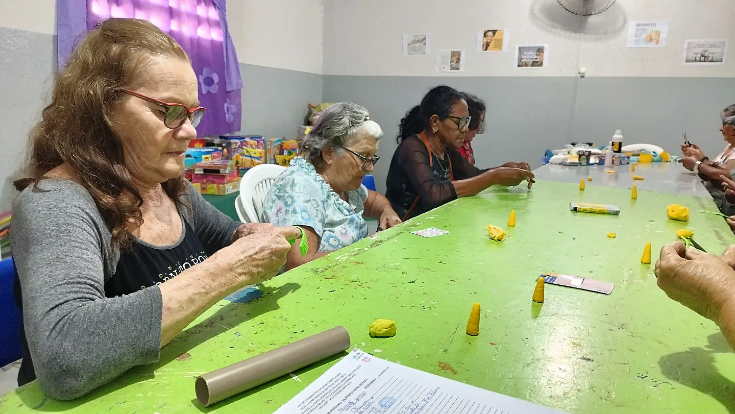 pessoa idosa em mais uma aula da oficina de artesanato em biscuit, que estão