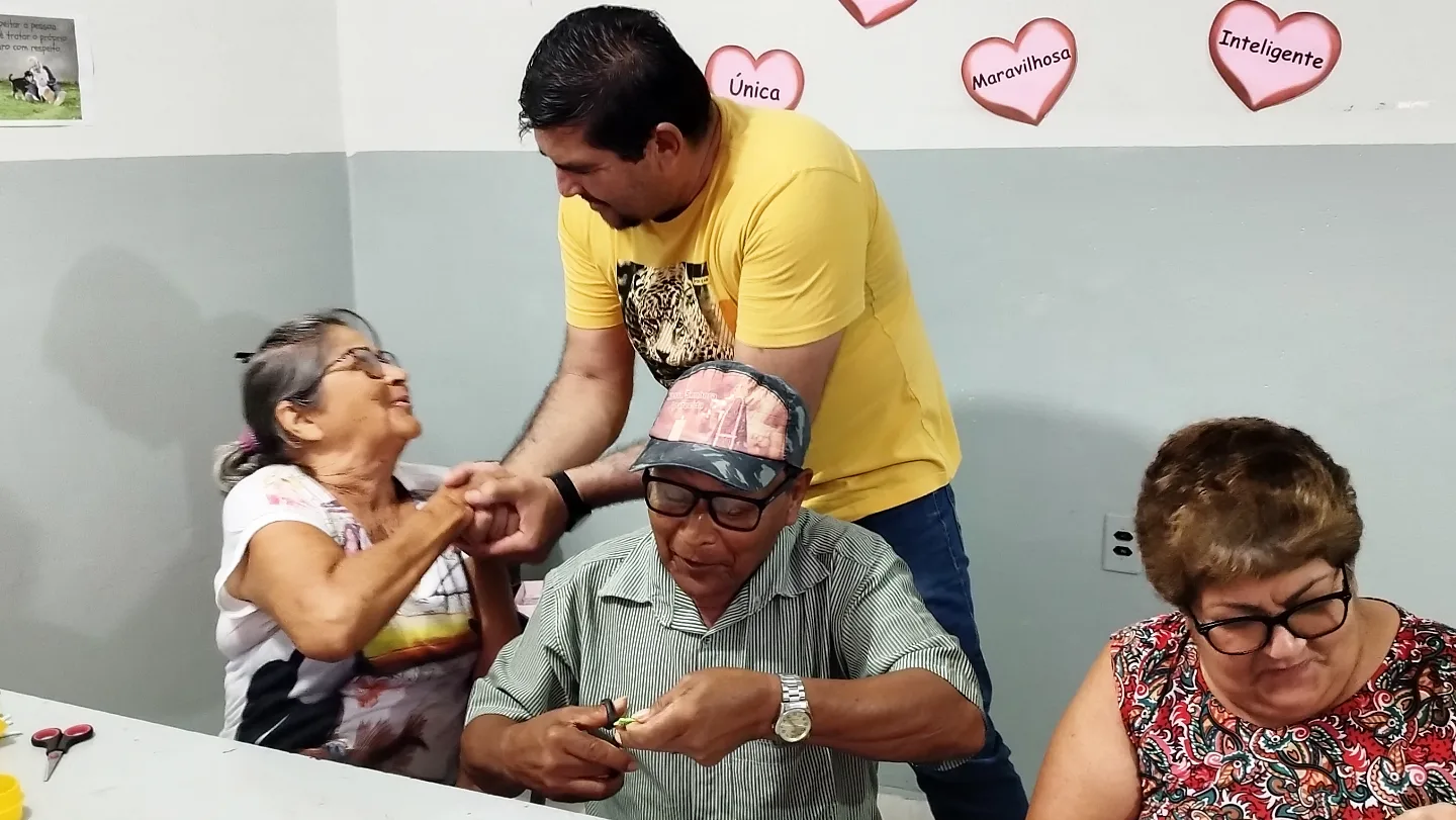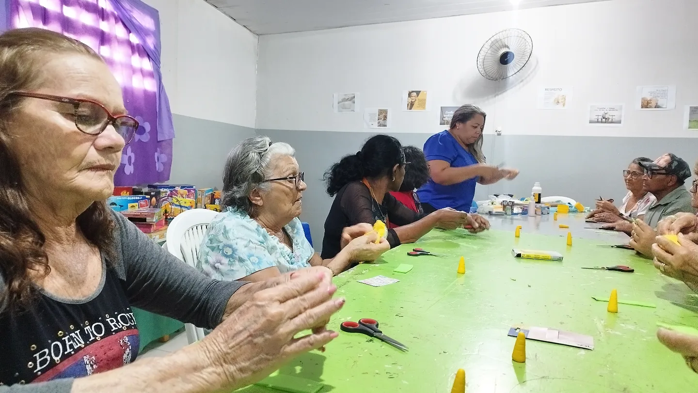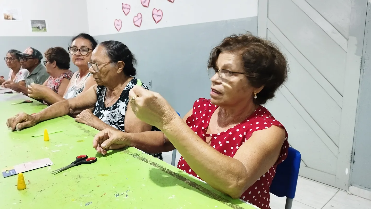 pessoa idosa em mais uma aula da oficina de artesanato em biscuit, que estão
