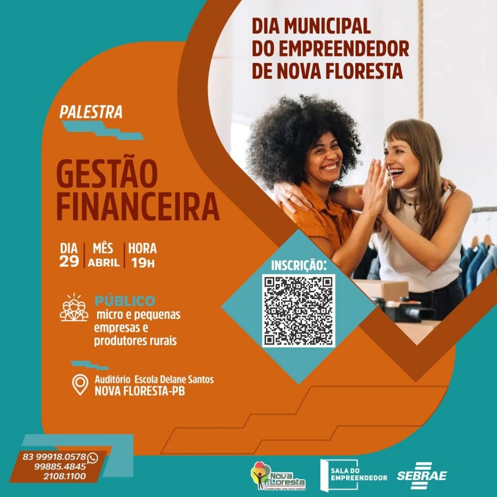 A Prefeitura Municipal de Nova Floresta em parceria com a Secretaria de Planejamento e Gestão Fiscal, juntamente com a Sala do Empreendedor realizará Nesta Segunda (29), Ás 19H no auditório da Escola Delane Santos, uma palestra sobre gestão financeira para as micro e pequenas empresas como também para os produtores rurais do nosso Município.