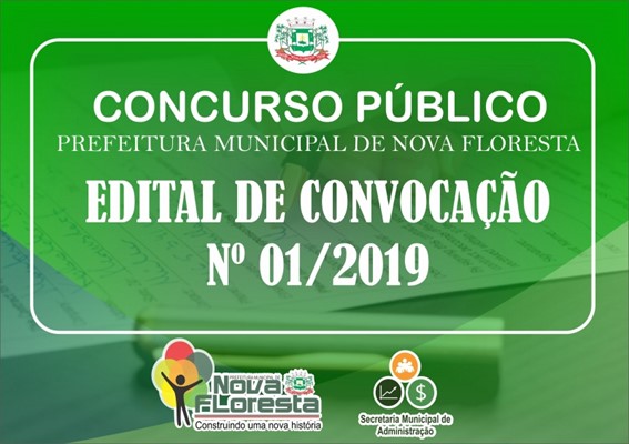 A Prefeitura Municipal de Nova Floresta-PB, divulgou nesta quinta-feira, 10 de outubro, o edital de convocação para os aprovados no Concurso Público 001/2019 para os cargos de enfermeiro, motorista,, psicólogo, médico, farmacêutico e técnico de enfermagem. Aqueles cujo nome constar na lista devem comparecer no prazo de 30 dias, a Secretaria de Administração da Prefeitura, à rua Benedito Marinho, 293, Centro, para manifestar o interesse em assumir o respectivo cargo. O horário de atendimento é de segunda a sexta-feira, das 07:30h às 11:30h e das 13:30h às 16;30h.