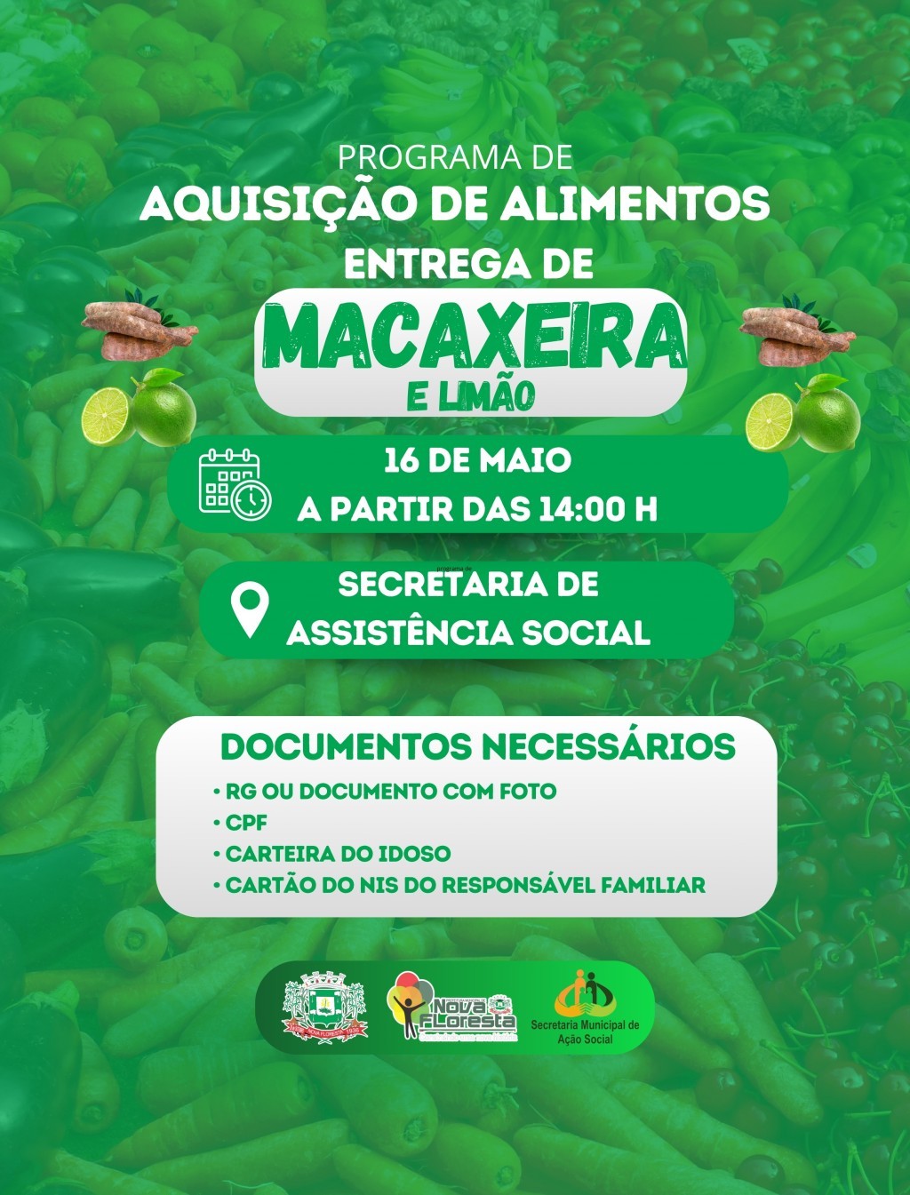A Prefeitura Municipal de Nova Floresta, em parceria com a Secretaria de Assistência Social Realizará nesta quinta-feira(16), a partir das 14H a distribuição de alimentos do Programa de Aquisição de Alimentos PAA.