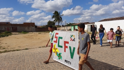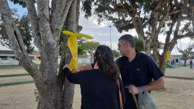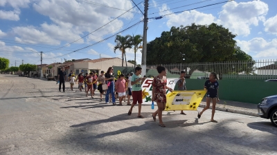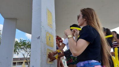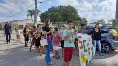 Os usuários, acompanhados da secretária Joana Darc e dos monitres do serviço, em caminhada, visitaram a praça do Coreto, onde decoraram o ambiente com a temática da campanha.