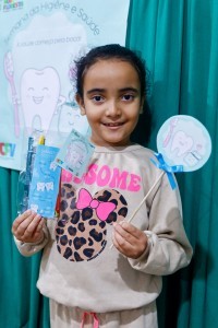 Ao final, foram entregues kits de escovação, incentivando a continuidade dos cuidados em casa.